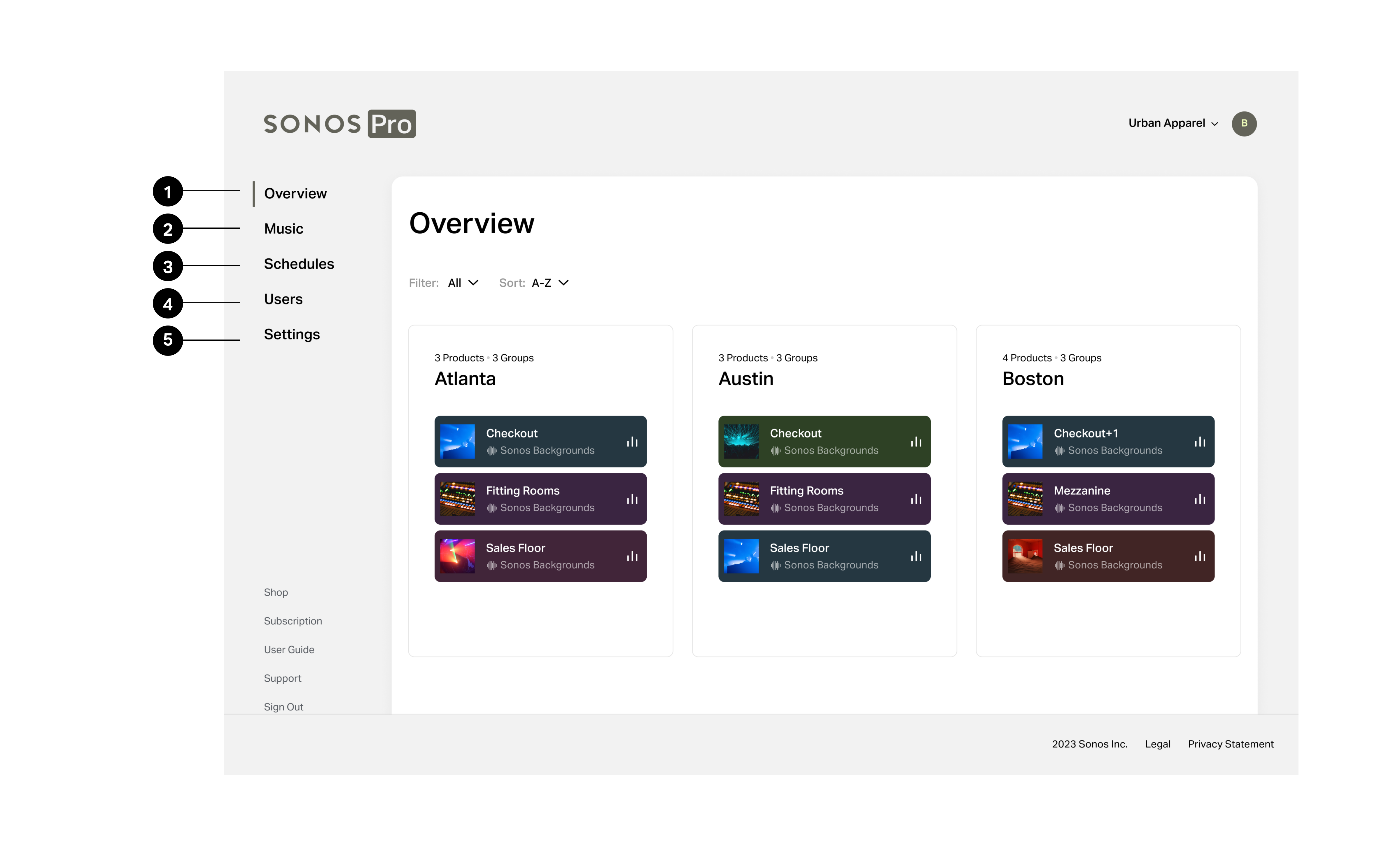 The Sonos Pro dashboard is used to remotely monitor system activity and manage content across all locations in real time. You must be an owner or administrator (admin) to sign in.