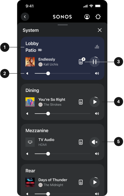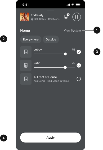 1 | Outputs | Select a card to change which output the app is targeting. Outputs are displayed as groups, home theaters, stereo pairs, portables Note: Choosing an output in your system view will not change where you active content plays. Go to the output selector |
