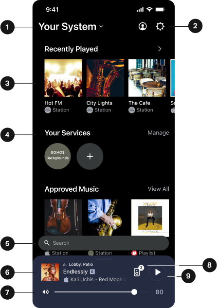 3 | Collections | Content in the Sonos app is sorted by collection. This includes Recently Played, Approved Music, pinned content, and more. Select Edit Home to customize your layout. |